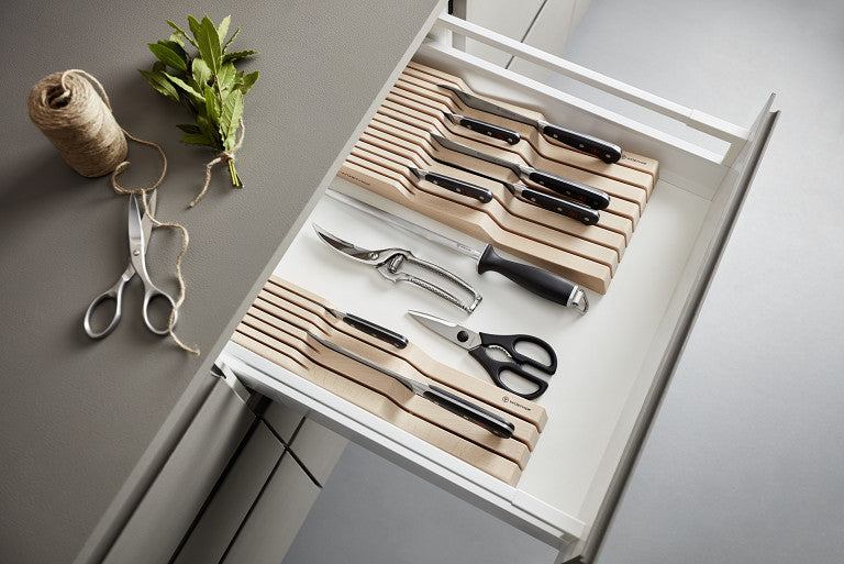Knife organizer that can be placed in a drawer. Wüsthof knives are worth protecting: this drawer insert fits all standard cutlery drawers and pull-outs and provides space for 7 knives (3 larger ones with blades up to 23 cm long and 4 smaller ones). The slots hold the blades firmly in place, preventing wear or damage caused by jamming or impact.