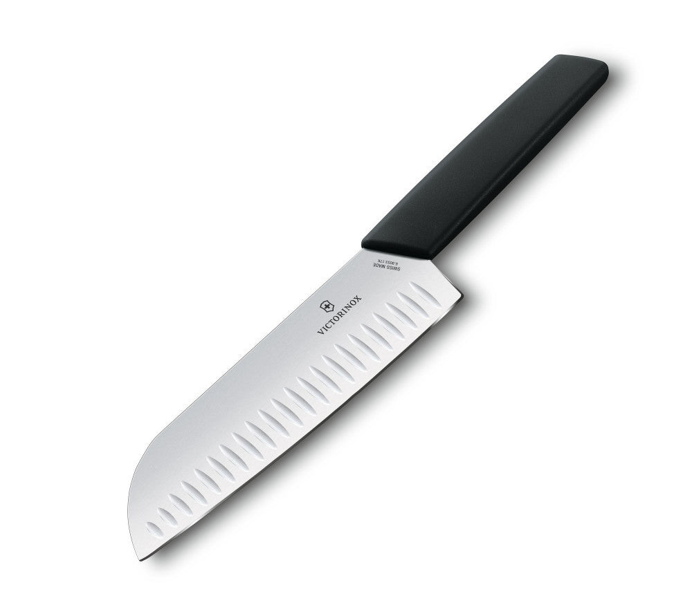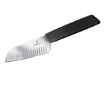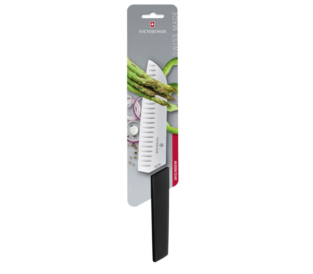 Victorinox Swiss Modern Santoku with 17 cm long ribbed blade and black handle.