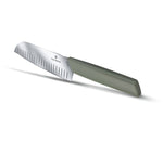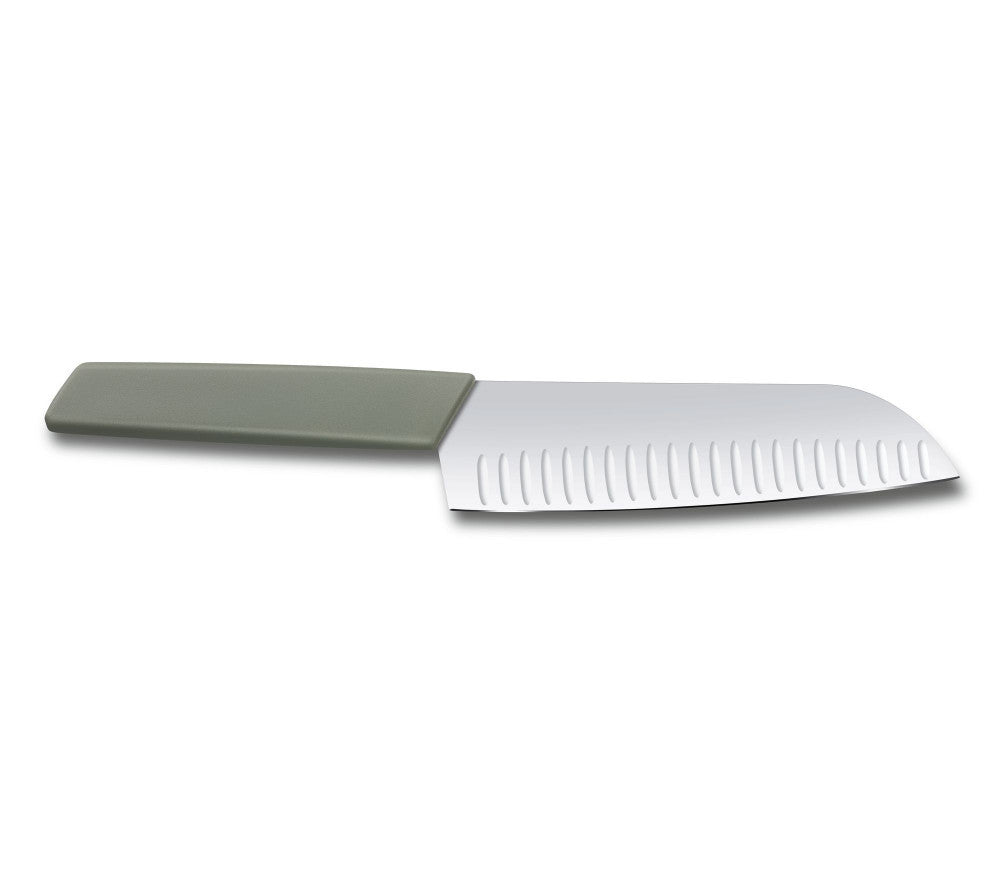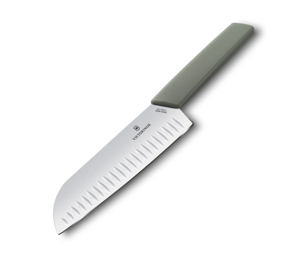 Victorinox Swiss Modern Santoku with 17 cm long ribbed blade and olive green handle.