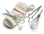 Our KitchenAid 9-speed hand mixer comes with not only 2 turbo beaters, but also a whisk, 2 dough hooks and a mixing rod (stick blender), all made of quality stainless steel, with a neat cotton storage bag.