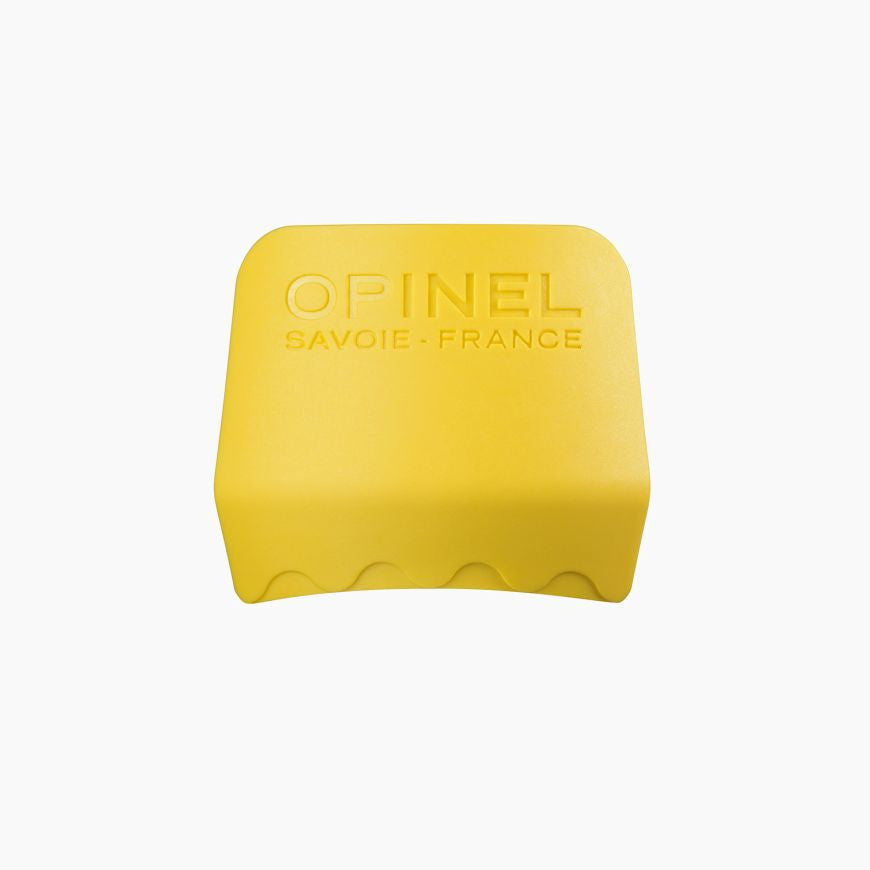This plastic shield allows to protect the hand which holds the food to be cut : the first two folded up phalanxes, the thumb and the little finger hold the food. The style of the Chefs!