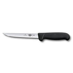 Victorinox Fibrox boning knife with a wide, 15 cm long blade and a black non-slip ergonomic plastic handle.